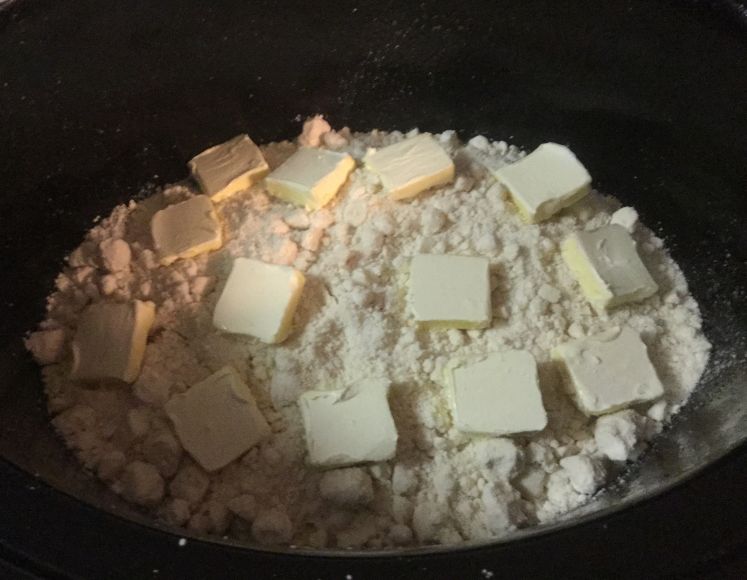 Apple Pie Filling And Cake Mix In Crock Pot - A Can Of Processed Pie Filling, Top With A Box Of Cake Mix And Melt And Drizzle One Stick Of Butter Then Cook On High For 2 ½ To 3 Hours.